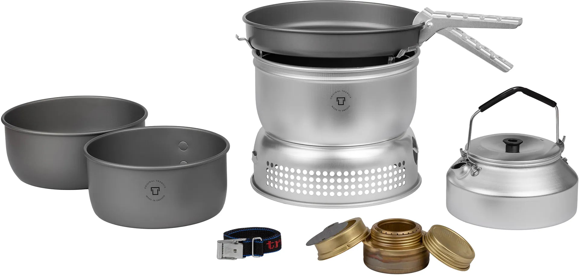 TRANGIA STOVE 25 LARGE is our larger stove, perfect for 3-4 people. All our stoves in series 25 include two saucepans sized 1.75 and 1.5 liters, a frying pan, a windshield (upper and lower part), burner, handle and strap. Kettle 0.9 liters is included depending on the model, and you can choose between spirit or gas burner.